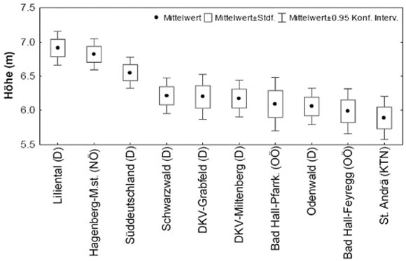 Der Vergleich der mittleren Baumhöhen zeigt ein ähnliches Bild (Abbildung 2): auch hier liegen die Herkünfte Liliental mit 6,9 m und Hagenberg-Mittersteig mit 6,8 m über dem Mittelwert aller Herkünfte (6,4 m). Auch die unter der Bezeichnung Süddeutschland, 300-500 m bezogene Herkunft hat sich im Höhenwuchs von den Anderen abgesetzt. Die schlechtesten Wuchsleistungen hinsichtlich BHD und Höhe wiesen die Herkünfte St. Andrä und Bad Hall-Feyregg sowie die oft aus Deutschland nach Österreich verbrachte Herkunft Odenwald auf. Die minimalen Unterschiede zwischen diesen Herkünften sind statistisch nicht nachweisbar.