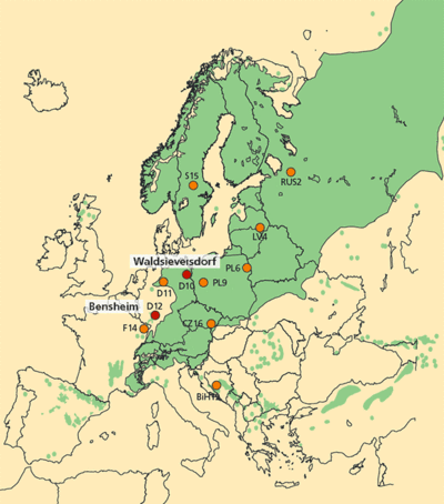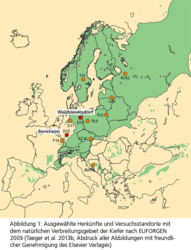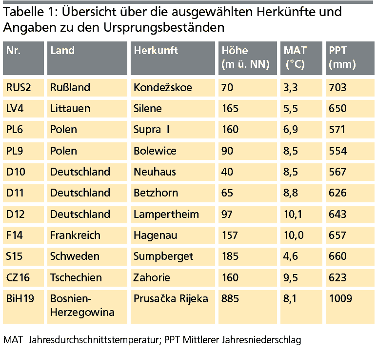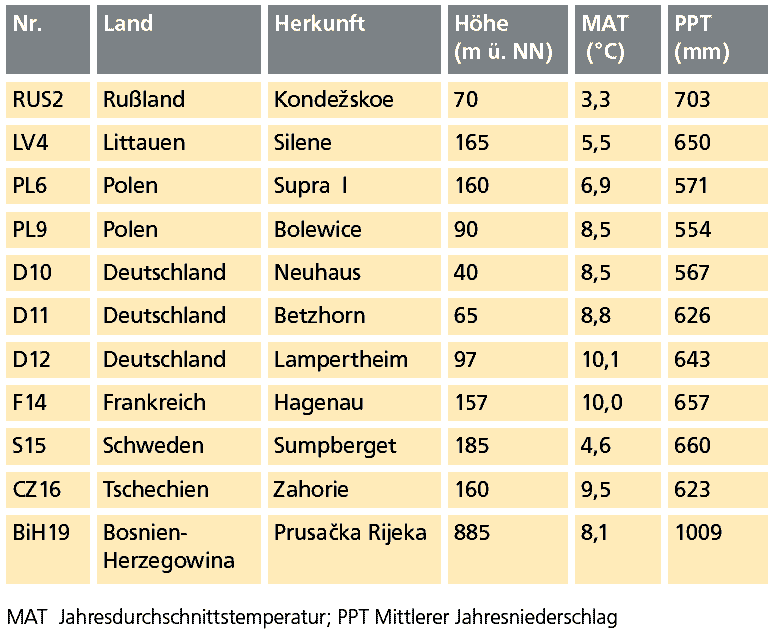 Beim internationalen Herkunftsversuch IUFRO 1982 wurden mit 20 Herkünften der Kiefer Versuchsflächen in fünf Ländern angelegt. Im KLIP 10 wurden elf Herkünfte an den zwei deutschen Standorten Waldsieversdorf (östlich von Berlin) und Bensheim (nördlich von Mannheim) untersucht (Tab. 1).