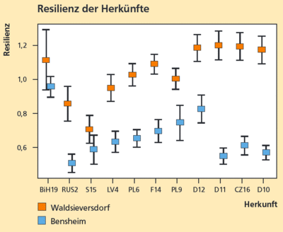 Die Resilienz beschreibt das Verhältnis Basalflächenzuwachs nach zu Basalflächenzuwachs vor dem Dürreereignis. Die Kiefernherkünfte unterscheiden sich hinsichtlich dieser Resilienz zwischen den beiden Standorten sehr deutlich (Abb. 4). In Waldsieversdorf erreichen die meisten Herkünfte nach dem Trockenereignis wieder ihr vorheriges Wachstumsniveau; einige übertrafen dieses sogar (Resilienz ≥ 1). Die tschechische und die deutschen Herkünfte übertreffen das Wachstumsniveau vor 2006 besonders deutlich. In Bensheim bleiben die Herkünfte im Mittel bei nur etwa 65 Prozent des Zuwachses vor dem Dürreereignis. Auffällig ist hier, dass die südliche Herkunft aus Bosnien-Herzegowina (BiH19) besonders gut abschneidet. Sie ist offensichtlich an Trockenereignisse besonders angepasst. Insgesamt erscheinen auch die jeweils lokalen Herkünfte (D10 in Waldsieversdorf, D12 in Bensheim) mit ihrer überdurchschnittlichen Resilienz gut gerüstet.