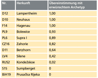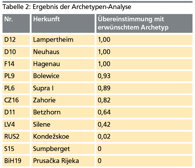 Die höchste Übereinstimmung mit dem erwünschten Archetyp weisen die lokalen Herkünfte D12 und D10 zusammen mit der französischen Herkunft F14 auf. Die Ergebnisse bestätigen die Bedeutung lokaler Effekte für spezifische Anpassung.