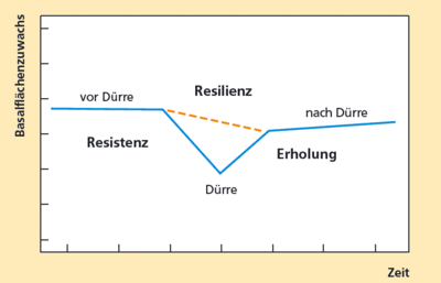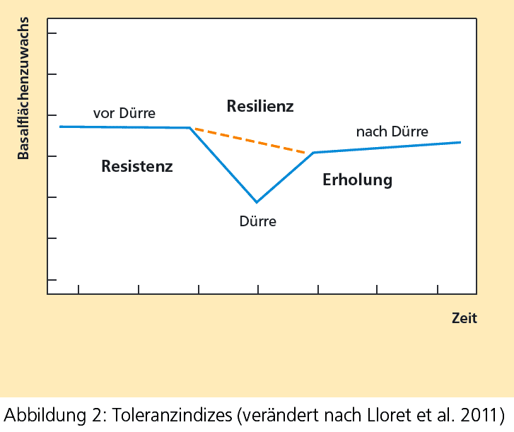 Für beide Standorte wurde die Beziehung zwischen den dort herrschenden Witterungsparametern und dem Wachstum durchleuchtet. Mit einem Wasserhaushaltsmodell konnte für Bensheim das Jahr 2003, für Waldsieversdorf das Jahr 2006 als jeweils extremstes Trockenjahr identifiziert werden. Die Wachstumsreaktionen der Herkünfte auf diese Dürreextreme wurden mit Hilfe von Toleranzindizes beurteilt. Neben der Resistenz und Erholungsreaktion wurde die Resilienz ermittelt (Abb. 2). Die Resilienz ist das Verhältnis des Wachstums nach dem Dürreereignis zu dem Wachstum vor dem Dürreereignis (Betrachtungszeitraum drei Jahre). Eine Gesamtbeurteilung der Herkünfte anhand der multivariaten Archetypenanalyse rundete die Untersuchungen ab.