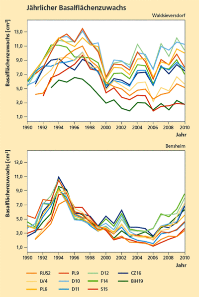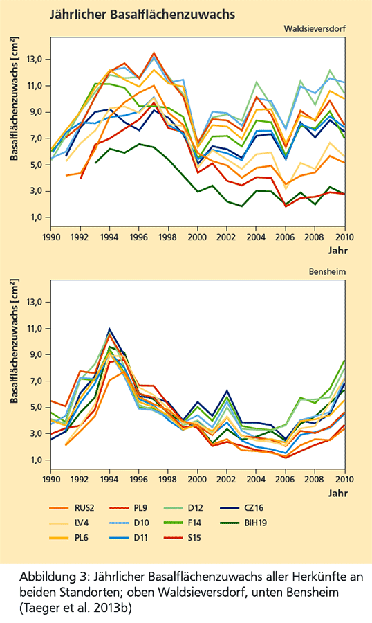 Der jährliche Basalflächenzuwachs (jährlicher Kreisflächenzuwachs) unterschiedet sich besonders stark zwischen den Herkünften in Waldsieversdorf (Abb. 3, oben). Die dort wachstumskräftigeren Herküfnte aus Deutschland und Polen konnten ihr Potenzial in Bensheim weniger deutlich zeigen (Abb. 3, unten). Die Zuwächse der Herkünfte liegen in Bensheim trotz längerer Vegetationsperiode auf niedrigerem Niveau enger zusammen. Das ist hauptsächlich auf die klimatischen Bedingungen beider Standorte zurückzuführen. Trotzdem erreichen auch in Bensheim fast alle Herkünfte die I. Bonität nach der Ertragstafel von Wiedemann.