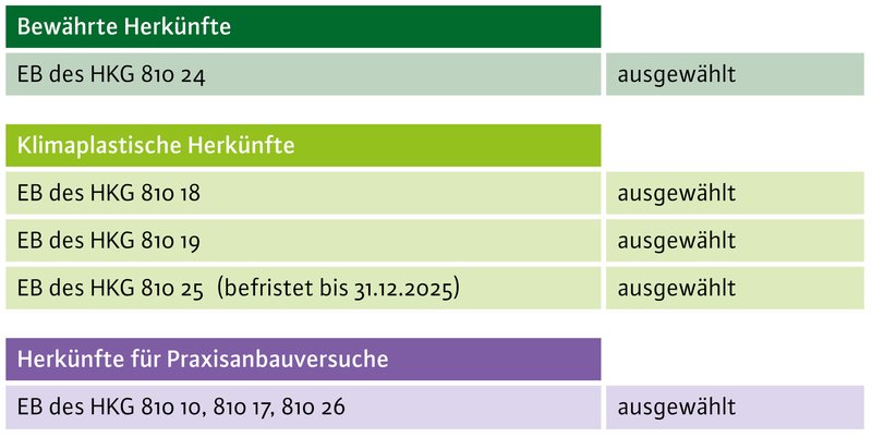 - Klimaplastische Herkünfte heimischer Baumarten wurden erstmals in die Empfehlungen einbezogen. Hier gilt das Prinzip, Herkünfte aus wärmeren Herkunftsgebieten mit niedrigeren Sommerniederschlägen zu empfehlen, da sie voraussichtlich besser an die zu erwartenden Umweltbedingungen angepasst sind. Zusätzlich wird Vermehrungsgut der Kategorien "geprüft" und "qualifiziert" empfohlen.