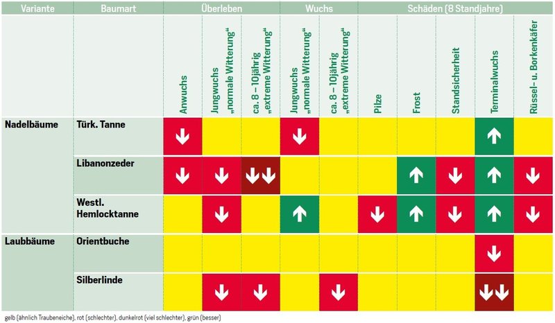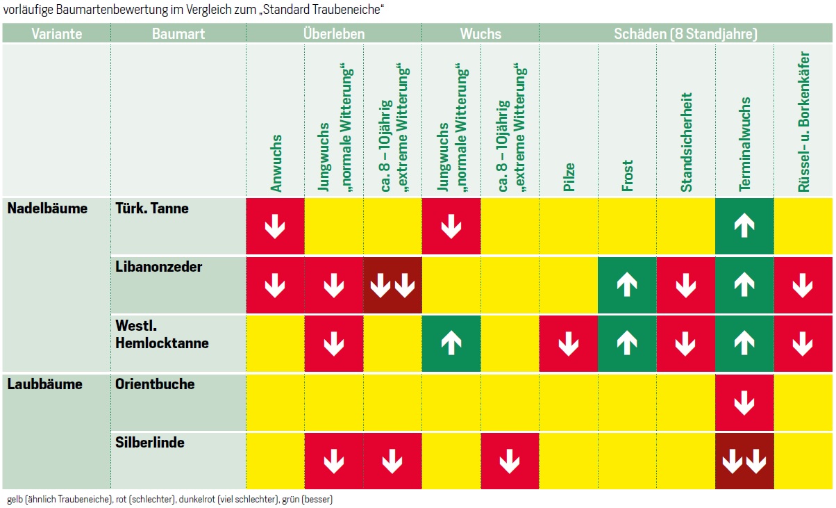 Orientbuche, Silberlinde, Türkische Tanne, Libanonzeder und Westliche Hemlocktanne werden seit 2012 im Vergleich zur heimischen Traubeneiche in einer besonders trocken-warmen Region in Thüringen getestet. Fast alle Baumarten überlebten und wuchsen akzeptabel, selbst in den Extremjahren 2018 bis 2020; erste Waldschutzprobleme treten inzwischen auf. Bisher dominiert aber die heimische Traubeneiche im Baumartenvergleich, die Silberlinde verliert.