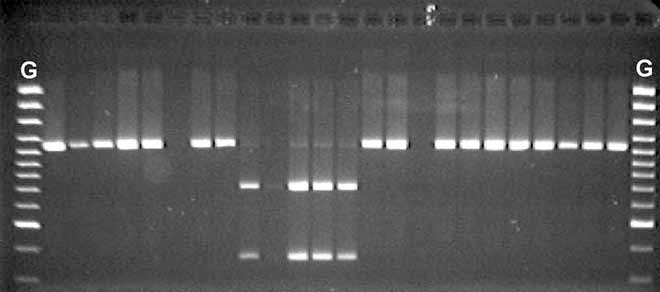 Abb. 3 - Agarose-Gel mit Schwarzpappel- und Hybridpappel-Proben. Die Bahnen mit nur einer weissen Bande (ungeschnittene DNA-Stücke) sind reine Schwarzpappeln, diejenigen mit zwei Banden (geschnittene DNA-Stücke) sind Hybridpappeln. G=Grössenstandard.