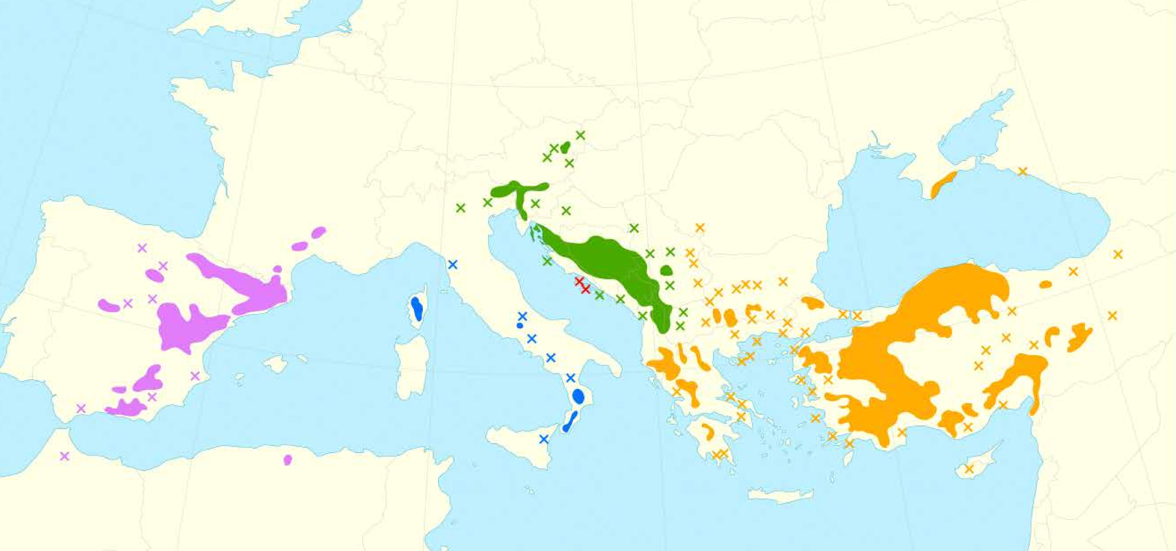 Auch anhand von räumlich-genetischen Strukturen kann die Schwarzkiefer nach SCOTTI-SAINTAGNE et al. in sechs Unterarten eingeteilt werden. Folgende Unterarten werden ausgewiesen: Pinus nigra salzmannii, Pinus nigra laricio, Pinus nigra nigra, Pinus nigra pallasiana, Pinus nigra caramanica und Pinus nigra dalmatica. Pinus nigra caramanica wird nach CAUDULLO et al. der Unterart Pinus nigra pallasiana zugeordnet (Abb. 1).