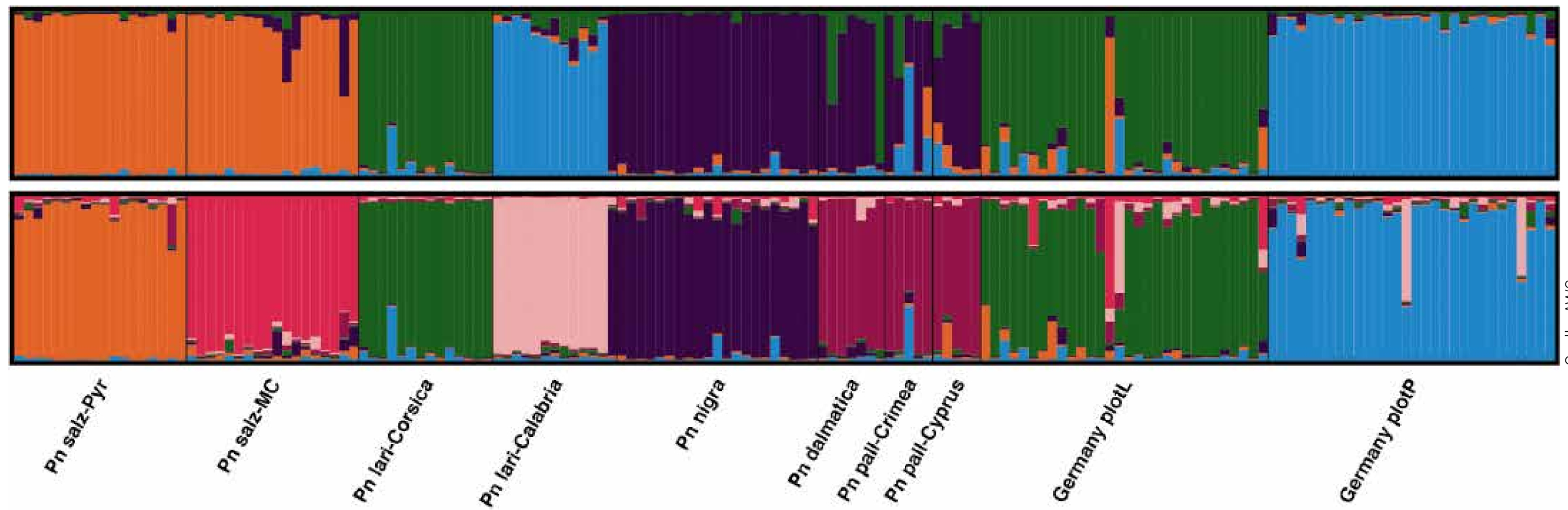 - GeneClass2: Die zweite Zuordnungsmethode ist in der Software GeneClass2 implementiert. Sie besteht darin, die Allele der sechzig beprobten Bäume mit bekannten, für die Unterarten der Schwarzkiefer repräsentativen Referenzen zu vergleichen. Das Ergebnis ist eine Zuordnungsstatistik. Für die Zuordnung eines Baum-Individuums zu einer Referenzpopulation wurde ein strenger Score von 95 % gewählt. Die Leistungsfähigkeit dieser Methode hängt stark von den verfügbaren Referenzpopulationen ab.