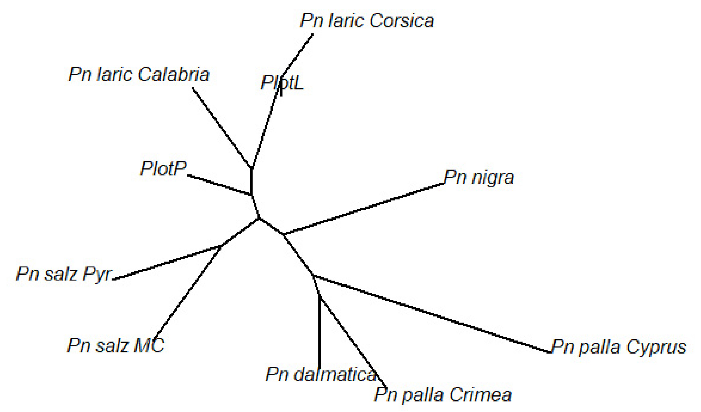 Für die grafische Darstellung der Ergebnisse wurde ein Neighbor-Joining-Tree verwendet. Abbildung 4 zeigt, dass die geringste genetische Differenzierung zwischen Parzelle L (Leinach) und den Referenzpopulationen bei der korsischen Pinus-nigra-subsp.-laricio-Gruppe liegt (Fst = 0,01; Fst > 0,06 bei anderen Referenzen). Die geringste genetische Differenzierung zwischen der Parzelle P (Mertener-Heide) und den Referenzpopulationen besteht bei der kalabrischen Pinus nigra subsp. laricio-Gruppe (Fst = 0,06; Fst > 0,08 bei anderen Referenzen).