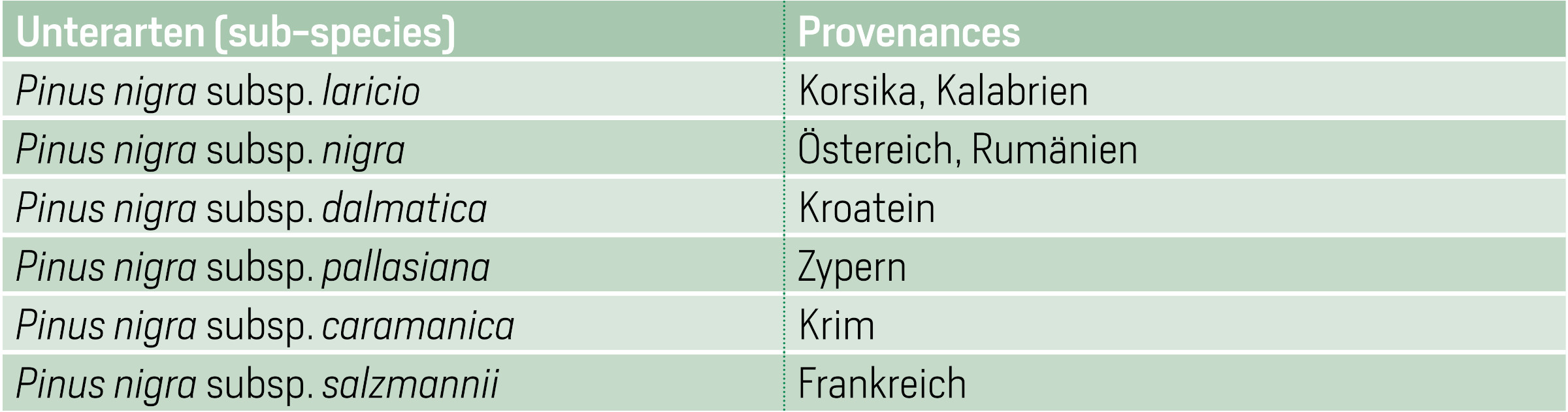 In der vorliegenden Untersuchung wurden die Varietäten Pinus nigra nigra var. austriaca und Pinus nigra laricio var. calabrica und corsicana verglichen. In verschiedenen Schwarzkiefer-Herkunftsversuchen konnten deutliche Unterschiede zwischen den Herkünften und Unterarten nachgewiesen werden.