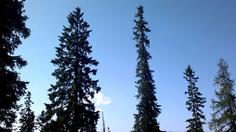 Abb. 1: Augenfällige Unterschiede im Wachstum haben oft genetische Ursachen, wie hier im Dachsteingebiet. Die Fichte Mitte rechts mit der schmalen Kronenform ist an Nass-Schnee-Deposition angepasst. Im selben Bestand gibt es aber auch andere Kronenformen.
