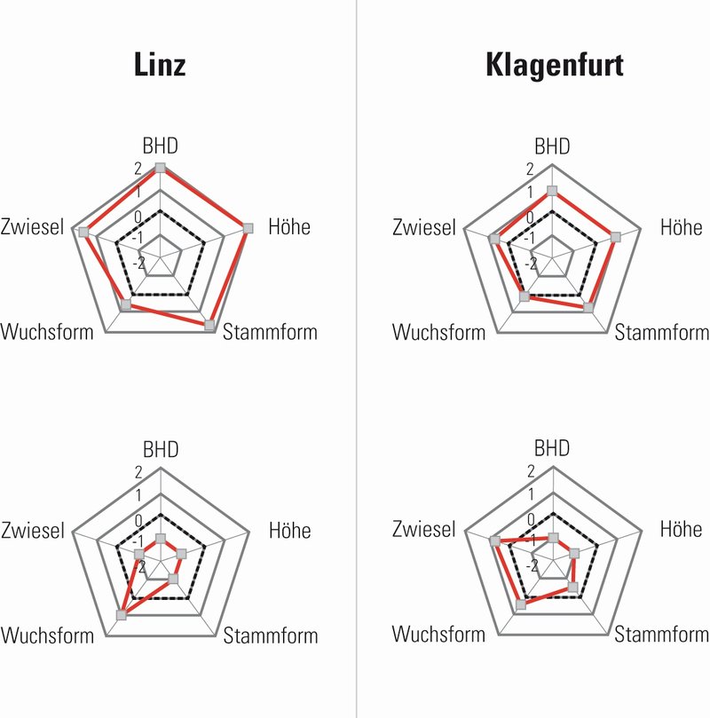 Wuchseigenschaften der Herkünfte Linz und Klagenfurt im Herkunftsversuch. Die strichlierte Linie stellt den Mittelwert über alle Herkünfte dar.