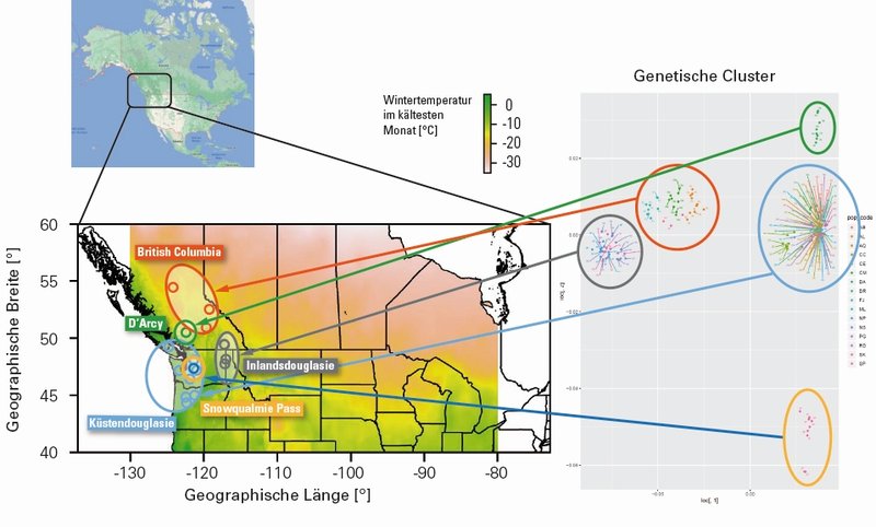 Moderne genetische Verfahren erlauben die herkunftsweise Zuordnung einzelner Pflanzgutpartien. Hier am Beispiel verschiedener Herkünfte der Douglasie im Ursprungsgebiet. Graphik: BFW / George