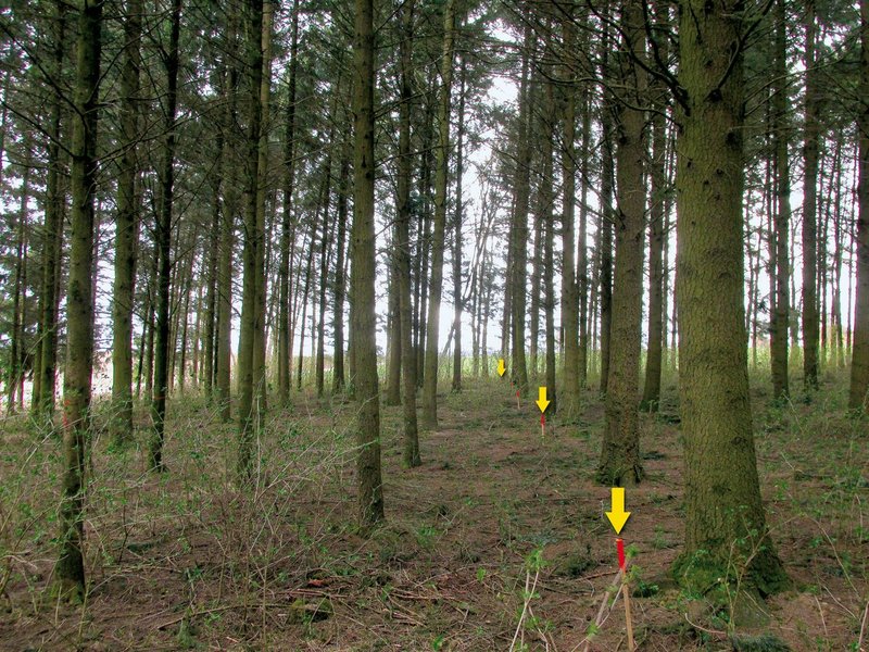 Abbildung 2: Die Wahl der richtigen Herkunft entscheidet über den wirtschaftlichen Erfolg einer Aufforstung. Die Markierungen zeigen die Grenze zwischen den Herkünften. Vordere Bildhälfte links: Herkunft Adams Lake, Provinz British Columbia/CN, vordere Bildhälfte rechts: Herkunft Mineral, BS Washington/USA). Foto: BFW / Weißenbacher