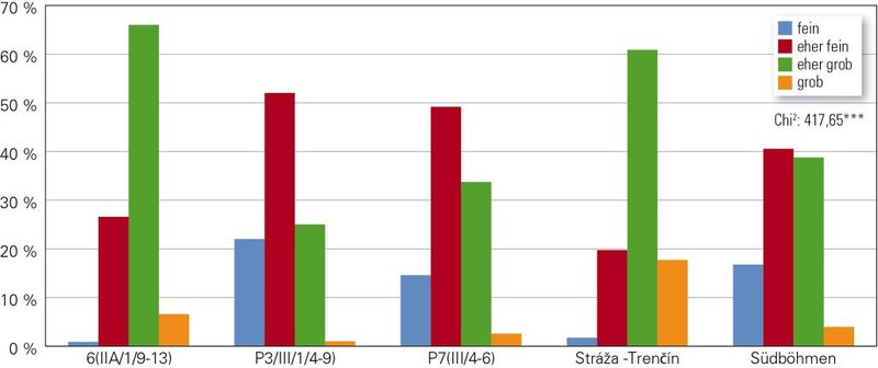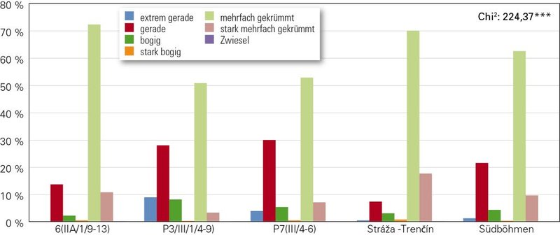 Hinsichtlich der Schaftform fällt auf, dass die beiden österreichischen Plantagenherkünfte "P3" und "P7" vergleichsweise hohe Anteile an wünschenswerten Schaftformen aufweisen (Abbildung 2).