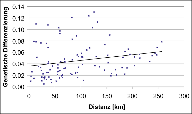 Abb. 4 - Zusammenhang zwischen genetischer Differenzierung (0 = genetisch identisch; 1 = genetisch völlig verschieden) und der geografischen Distanz (in km). Benachbarte Bestände sind sich zwar genetisch ähnlicher als weit entfernte Bestände. Der Zusammenhang ist allerdings nur schwach (kleine Steigung der Geraden).