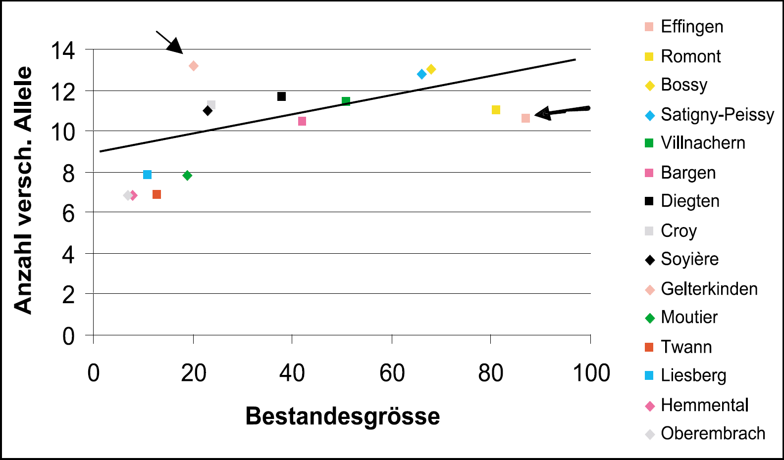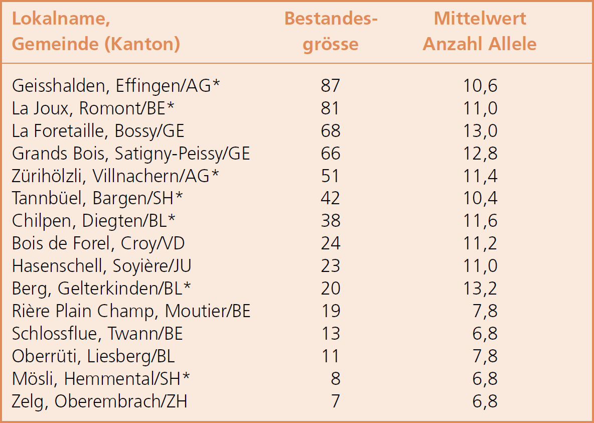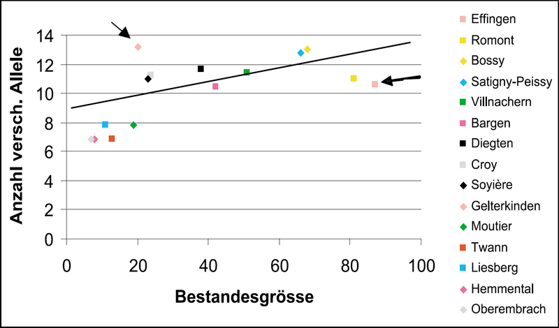 Der Grund für dieses im ersten Moment erstaunliche Ergebnis ist wahrscheinlich in der Bestandesgeschichte zu suchen. So könnten beispielsweise Lebensraumveränderungen (Einwuchs von Wytweiden), aber auch so genannte Flaschenhals- oder Gründereffekte die heutige genetische Vielfalt stark beeinflusst haben. Solche historischen Ereignisse stehen nicht direkt mit der heutigen Bestandesgrösse im Zusammenhang. In einer weiterführenden Untersuchung liess sich in keinem der untersuchten Bestände eindeutig ein Flaschenhalseffekt nachweisen.
