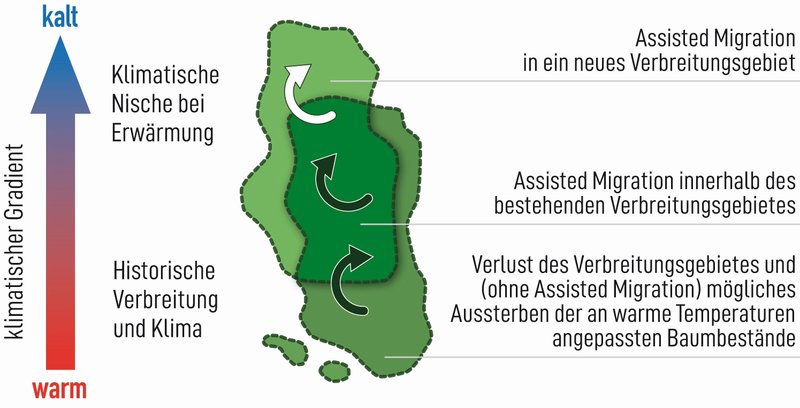 "Assisted Migration" ist die unterstützte Wanderung von Pflanzen einer Baumart in klimatisch geeignetere Gebiete. Im Normalfall können Baumarten durch Samenausbreitung auf natürliche Weise neue Areale mit geeigneten Umweltbedingungen erschließen. Der anthropogen verursachte Klimawandel ist allerdings zu schnell für die meisten Waldbestände. Durch die "unterstützte Wanderung" wird den Bäumen bei der Ausbreitung unter die Arme gegriffen, indem im Zuge von Aufforstungen oder Ergänzungspflanzungen Samenherkünfte verwendet werden, die mit dem zukünftigen Klima besser zurechtkommen (Abbildung 2).