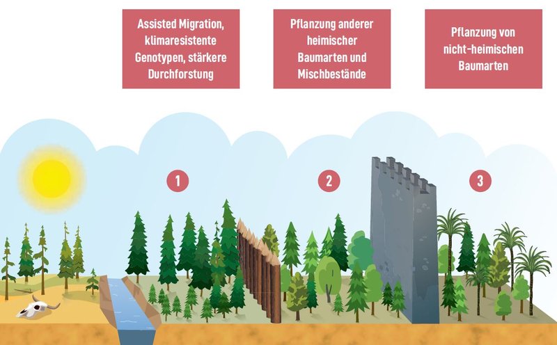 Die verschiedenen Anpassungsmaßnahmen lassen sich in drei Strategien zur Erhaltung der Waldfunktionen und Ökosystemleistungen einteilen (Abbildung 1). Die erste Verteidigungsstrategie zielt nicht primär auf eine Änderung der Baumartenzusammensetzung ab, sondern auf die Erhaltung und Vitalisierung der derzeitigen Waldgesellschaften. Diese Strategie umfasst Maßnahmen wie "Assisted Migration", aber auch waldbauliche Eingriffe, wie frühe und stärkere Durchforstungen.