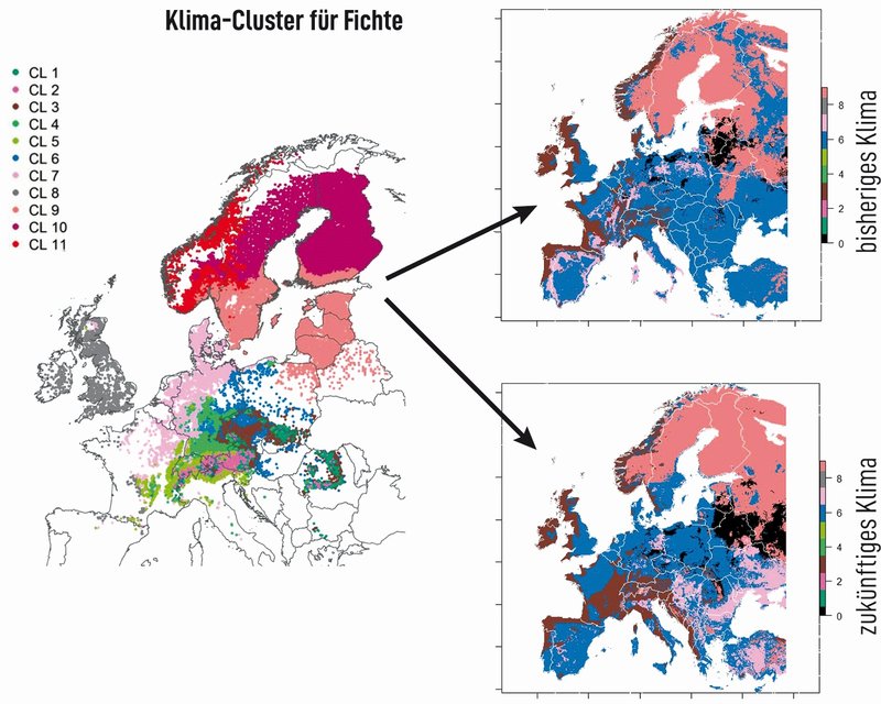 Abbildung 3: Die linke Abbildung zeigt das Vorkommen der Fichte in Europa, unterteilt in Herkunftsregionen mit ähnlichem Klima. Die rechten Abbildungen zeigen, welche Gruppen von Herkünften am besten unter dem bisherigen und zukünftigen Klima geeignet sind.