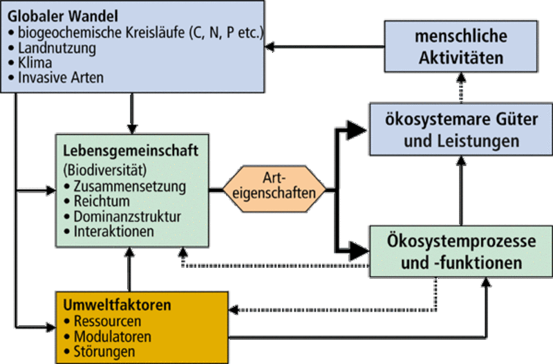 Abb. 5: "Funktionale Biodiversitätsforschung" beschreibt und misst, wie sich Veränderungen in den Lebensgemeinschaften auf die Eigenschaften von Ökosystemen sowie die in ihnen ablaufenden Prozesse auswirken (Verändert nach [33]).