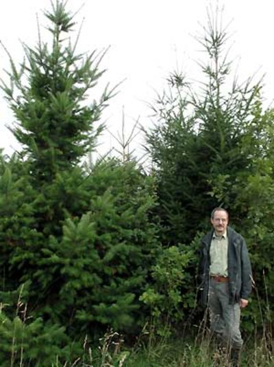Abb. 4: Der Standort "Kaltenborn" im BIOTREE-Experiment [26] im September 2010, sieben Jahre nach der Pflanzung. Im Bild Revierleiter Klaus Hahner vor einer Vier-Artenmischung aus Buche, Eiche, Fichte und Douglasie.