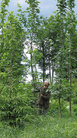 Vorwüchsiger Bergahorn-Kleintrupp im Fichtengrundbestand auf der Dauerversuchsfläche 920 bei Gerolding; für die Wertholzerziehung werden Formschnitte und Astungsmaßnahmen durchgeführt
