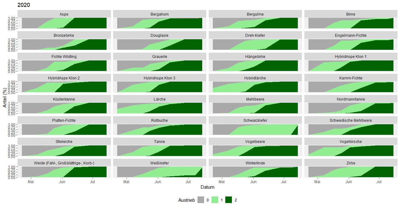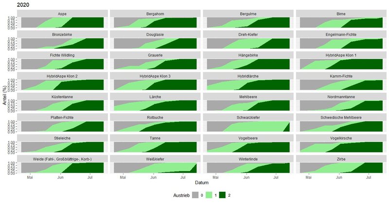 Der Austrieb der Bäume im Jahr 2020 ist in Abbildung 2 dargestellt. Die Unterschiede sind enorm. Manche Baumarten reagieren auf die Erwärmung im Frühjahr sehr schnell und treiben rasch aus. Das trifft besonders für die Hybrid-Aspen, die Hybridlärche, Kirsche und Ahorn und Ulme zu. Besonders die Kiefern treiben spät aus und die Entwicklung der Nadeln zieht sich über einen langen Zeitraum hin. Die Fichten und Tannen liegen im Mittelfeld. Natürlich sind die früh austreibenden Baumarten besonders gefährdet, von Frost geschädigt zu werden.