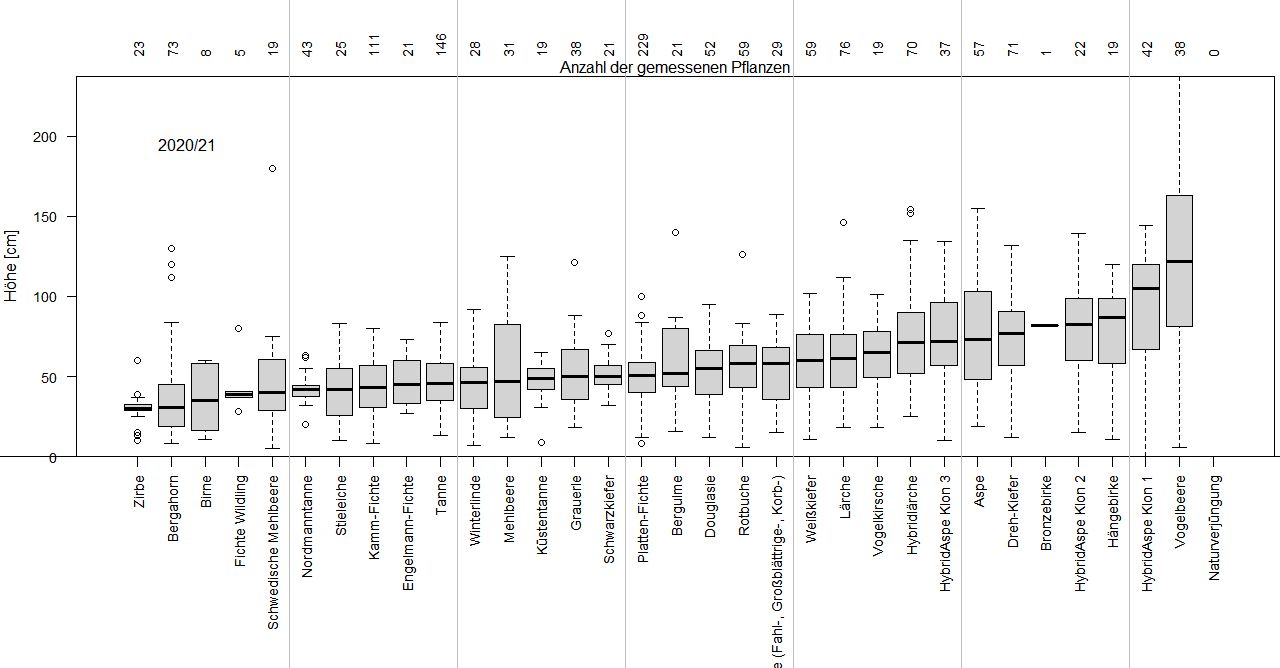 Die Höhenentwicklung der Baumarten ist in Abbildung 3 dargestellt. Insgesamt waren die meisten Laubhölzer größer als die Nadelhölzer und überragten die üppige Grasflur des Wald-Reitgrases. Besonders die Vogelbeere und die Hybrid-Aspen haben sich rasch entwickelt. Die Fichten sind eher im Mittelfeld und die Zirben sind besonders klein.