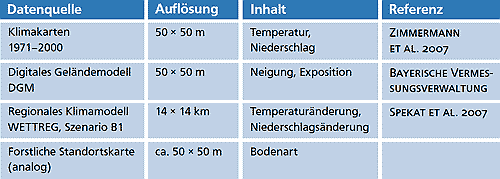 Für die provisorischen Klima-Risikokarten wurden landesweit digital vorliegende Datenquellen (Tab. 1) verwendet. Entwickelt wurden Karten für die Perioden 2000, 2050 und 2100. Die Informationen zur Bodenqualität konnten noch nicht digital eingearbeitet werden. Daher sind die neuen Risikokarten ergänzend mit den herkömmlichen Standortkarten anzuwenden.