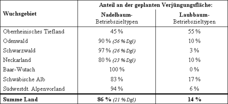 Tab. 1: Verjüngungsplanung im öffentlichen Wald von Baden-Württemberg im Zeitraum 1961-1970 (Betriebszieltypen-Planung; Forsteinrichtungsstatistik 1961/70).