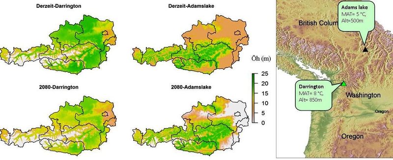 Die Wahl der Herkunft spielt eine wichtige Rolle bei der Anpassung der Wälder an den Klimawandel. Die nicht-heimische Douglasie, zum Beispiel, zeigt je nach Herkunft große Unterschiede im Wachstumspotential. Die Abbildung verdeutlicht das Wachstumspotential (bezogen auf die Oberhöhe im Alter von 24 Jahren) von Douglasien zweier unterschiedlicher nordamerikanischer Herkünfte aus der Adams Lake (eine kalte und trockene Region im Bundestaat British Colombia) und Darrington (eine feuchte und warme Küstenregion im Bundestaat Washington). Sowohl unter dem derzeitigen Klima als auch mit zunehmender Klimaerwärmung ist das prognostizierte Wachstum der Douglasienherkünfte aus Darrington, der warmen Küstenregionen, besser als jene aus dem Inland.
