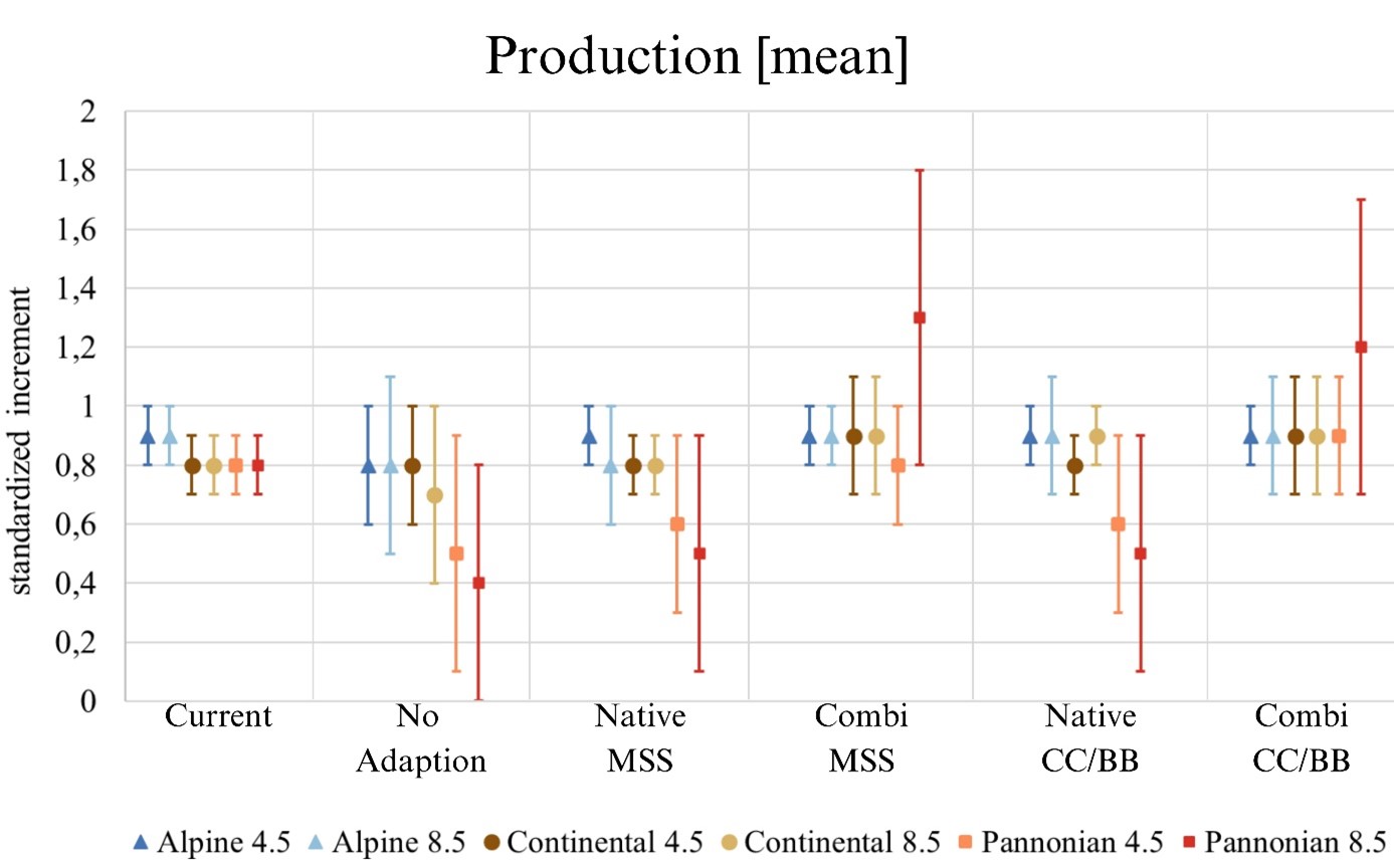 Eine Möglichkeit, dem Verlust der Holzproduktion im Tiefland entgegenzuwirken (kontinental und pannonische Zone), könnte in der Verwendung von nicht-heimischen Baumarten bestehen. Die Ergebnisse der Studie weisen auf die potenziellen Vorteile eines solchen Ansatzes hin. Eine Kombination aus einheimischen und nicht-heimischen Baumarten könnte insbesondere in Tieflandgebieten mit geringen Niederschlägen, wie der pannonischen Zone, von Vorteil sein.