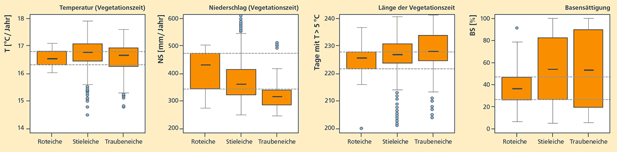 Alle Inventurpunkte, an denen die Gattung Quercus vorkam, wurden mit Standort- und Klimainformationen aus dem Projekt KLIP 4 verknüpft. In Abbildung 4 ist die Verteilung einiger Parameter sowie die obere bzw. untere Quartilsgrenze der Roteiche dargestellt. Für den Leistungsvergleich wurden nur einheimische Eichen berücksichtigt, bei denen die physiographischen Parameterwerte innerhalb dieser Grenzen lagen. Hierdurch werden die Datensätze der einheimischen Eichen deutlich reduziert. Es konnten 81 Roteichen, 108 Steileichen und 47 Traubeneichen zu Vergleichszwecken herangesogen werden.