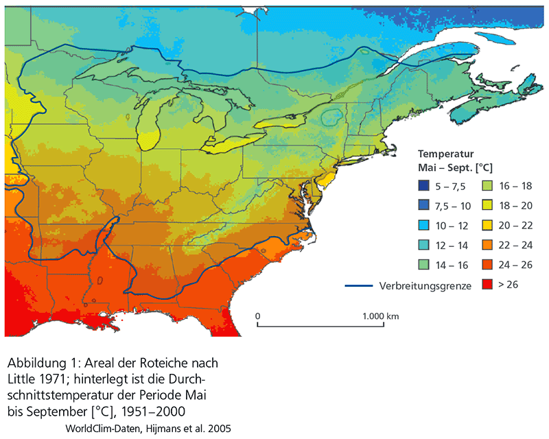 Im natürlichen Verbreitungsgebiet der Roteiche gibt es jährliche Niederschlagsmengen zwischen 760 und 2.030 mm, die Jahresdurchschnittstemperaturen schwanken sehr weit zwischen 4 und 16 °C (Abb. 1). In ihrer Heimat bevorzugt die Roteiche eher tiefgründige Standorte. Sie gilt nicht als Baumart, die sich auf Extremstandorten bewährt. Nach dem Tulpenbaum (Liriodendron tulipifera) ist sie die wirtschaftlich bedeutendste Laubholzart ihrer Heimat, die überwiegend in Mischbeständen mit Stroben und anderen Laubhölzern aufwächst. Die Roteiche besitzt folgende ökologische Charakteristika: