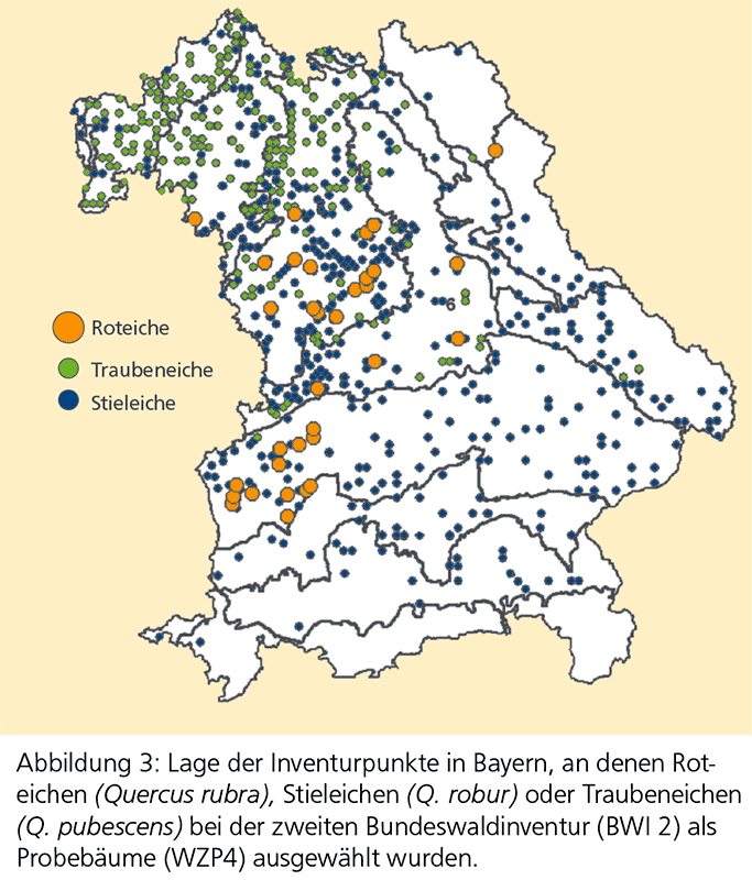 Unter Verwendung von Daten der ersten und zweiten Bundeswaldinventur (BWI1 bzw. BWI2) soll ein Vergleich bayerischer Eichen auf Einzelbaumebene angestellt werden. Während sich die Traubeneiche in Nordwestbayern konzentriert, wurde die Stieleiche schwerpunktmäßig in Süd- und Südostbayern aufgezeichnet; die Roteiche beschränkt sich auf wenige Inveturpunkte vor allem im Fränkischen Keuper und im Tertiären Hügelland (Abb. 3). Bei der BWI2 wurden in Bayern lediglich 81 Roteichen an 33 Inventurpunkten als Probebäume ausgewählt (Tab. 1).