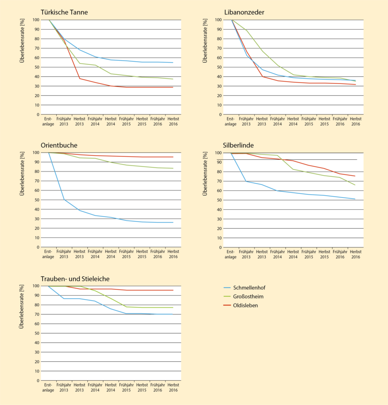 Im Folgenden werden die Ergebnisse der drei Flächen in Bayern und Thüringen vorgestellt. Über alle Baumarten hinweg sind in den ersten zwei Jahren im Vergleich zu den Folgejahren die Ausfälle am höchsten. Allerdings unterscheiden sich die Überlebensprozente je nach Baumart und Standort. Am wenigsten wirkt sich der Standortsunterschied zwischen den Versuchsflächen bei der Zeder aus, am stärksten bei der Orientbuche. Hohe Ausfälle auf allen drei Standorten finden sich bei der Tanne und Zeder. Im Vergleich der Baumarten weisen Silberlinde und heimischen Eichen noch hohe Überlebensraten auf. Bereits nach dem ersten Winter sind die Ausfälle im Sommerhalbjahr und Winterhalbjahr fast auf dem gleichen Niveau.