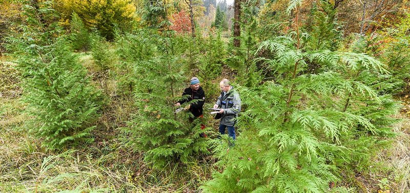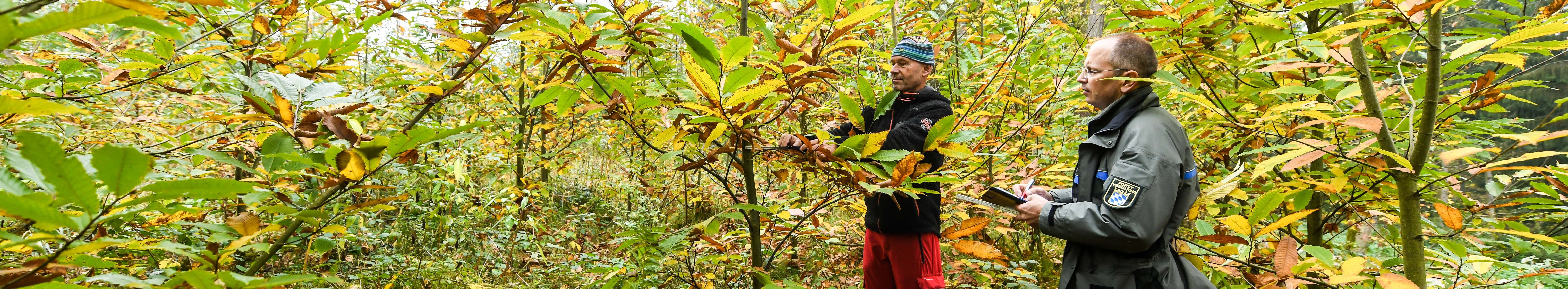Abb. 1: Zwei Mitarbeiter der Forstverwaltung bei der Überprüfung eines Anbauversuches mit nicht-heimischen Baumarten (Foto: Tobias Hase, StMELF).