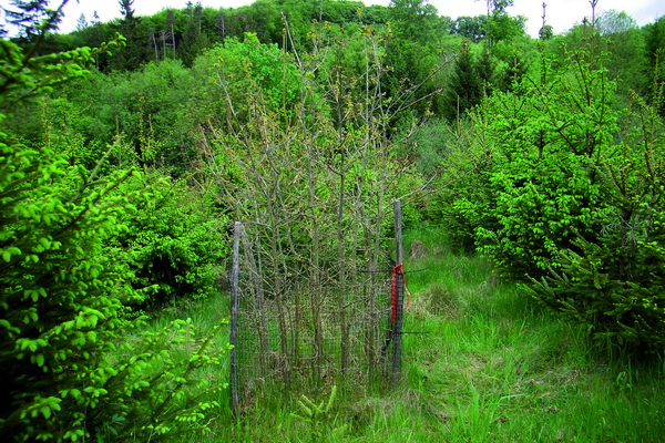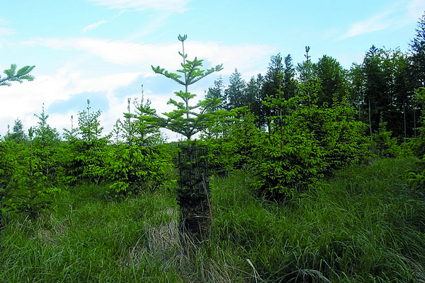 - Die Tanne war auch bei der vorliegenden Freiflächensituationen gut geeignet. Es traten weder Frostschäden noch Lausbefall auf. Stattdessen wurden massive, illegale Reisigentnahmen beobachtet, die bei vielen Jungtannen zu reduzierten Kronen und daraus folgend zu Zuwachsverlusten führten. Dementsprechend war die mittlere Höhe der Oberschichtbäume nach 21 Vegetationsperioden bei der Tanne mit 12 Metern etwa 2 Meter niedriger war als bei Fichte und Bergahorn (jeweils zirka 14 Meter). Aufgrund der Tendenz zur Vorwüchsigkeit der Fichte unter Freiflächenverhältnissen sollten eher trupp- bis gruppenförmige Mischungsformen zum Einsatz kommen.
