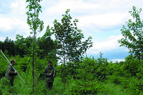 - In einem angrenzenden Horst aus reinem Bergahorn (2.500 Quadratmeter, Verband 2 x 2 Meter) sieht die Situation anders aus: Hier erreichte der Bergahorn nach 16 Vegetationsperioden eine mittlere, astfreie Schaftlänge von ca. 6 Metern, überwiegend aufgrund natürlicher Astreinigung und mit nur geringen Kosten. Lediglich einzelne Äste wurden im Zuge der Z-Baumauswahl mit der Stangensäge entfernt.
