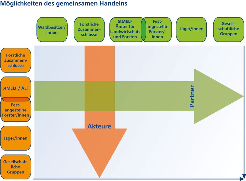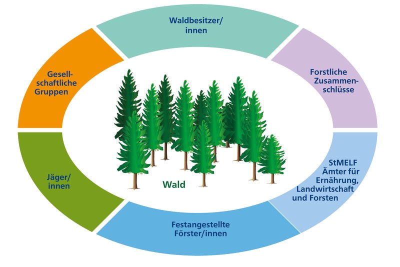 Jeder einzelne stellt an den Wald verschiedene Ansprüche. Dennoch lassen sich verschiedene Anspruchsgruppen zusammenfassen: Waldbesitzer, forstliche Zusammenschlüsse (FZus), Behörden, Förster, Jäger und gesellschaftliche Gruppen (z.B. Naturschutzverbände).