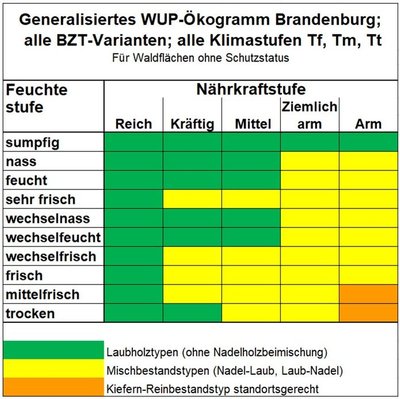 Die Zuweisung von Bestandeszielen (BZT) erfolgt auf der Basis von Standortsgruppen. Grundlage bildet der BZT-Erlass 2006, der insgesamt 46 BZT für die Brandenburger Wälder ausweist (28 Laubholz-Typen, 6 Laub-Nadel-Mischtypen, 10 Nadel-Laub-Mischtypen, 2 Nadelholz-Typen). Für Bestände mit Schutzgebietsstatus wurden darüber hinaus naturnahe BZT empfohlen, die dem natürlichen Waldaufbau auf dem jeweiligen Standort nahe kommen. Auch hier erfolgte die Zuordnung der BZT zu den drei WU-Gruppen, die in einem Ökogramm (Abb. 2) generalisiert wurden. Durch Verschnitt der digitalen Standortskarte mit der Forstgrundkarte war letztlich die Datenbasis für eine standörtliche Feinplanung bis auf Bestandesebene gegeben.