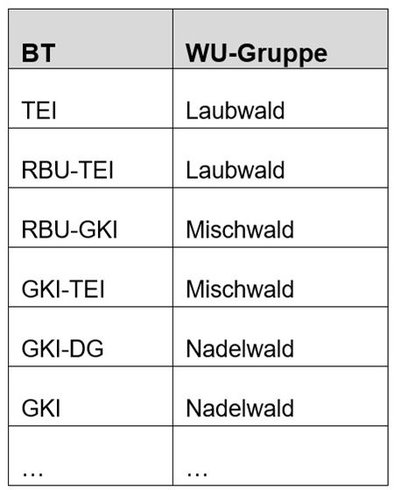 Tab. 1: Beispiel für das Zusammenfassen der 118 Bestandeszustandstypen (BT) zu drei Waldumbau-Gruppen