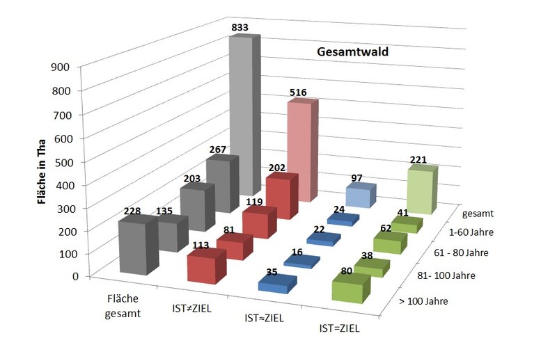 Insbesondere die Flächen der Kategorie IST≠ZIEL mit einem Alter des Oberstandes von mehr als 80 Jahren erfordern ein dringendes Handeln. Im Wald aller Eigentumsarten betrifft das 194 Tha (113+81 Tha; 23 % der betrachteten Waldfläche). Aber auch in den unter 60jährigen Beständen ergibt sich umfangreicher Handlungsbedarf. Insgesamt weicht noch bei 62 % der Waldfläche der aktuelle Bestandeszustand (BT) vom angestrebten Bestandesziel (BZT) ab.