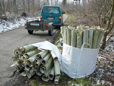 Ein Recycling als PP-Rohstoff oder Ersatzbrennstoff erfordert einen größeren Anfall an Materialen, weil die abgebauten Hüllen in einem möglichst großen Container (Abb. 1) zu einem Recyclingcenter verbracht und dort aufgearbeitet werden müssen. Das bedeutet aber auch, dass die Hüllen am Waldort vorkonzentriert und dann zum zentralen Ort, wo der Container steht, verbracht werden müssen (Abb. 2). Deshalb sollte man die Hüllen möglichst kompakt transportieren. Dabei hilft es, wenn es sich um runde Röhren handelt, diese aufzuschlitzen – zum Beispiel mit einem Teppichmesser – um sie dann ineinanderstecken zu können (Abb. 3 und 4). Dadurch können die Kosten wesentlich beeinflusst werden. Andere Einflussfaktoren sind die Entfernung von der Waldstraße, die Verwilderung der Fläche (Dornen) und die Steilheit des Geländes.