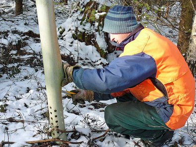 Wenn die Hülle ihre Funktion verloren hat und davon ist spätestens dann auszugehen, wenn sie neben dem Baum am Boden liegt (siehe Abb. 6), stellt sich die Frage, ob der Waldbesitzer/-eigentümer verpflichtet ist, die Hülle zu beseitigen. Ein Blick ins Kreislaufwirtschaftsgesetz vom 24. Februar 2012 (BGBl. I S. 212), das zuletzt durch § 44 Absatz 4 des Gesetzes vom 22. Mai 2013 (BGBl. I S. 1324) geändert worden ist, kann da hilfreich sein. Nach § 3 Abs. 1 dieses Gesetzes sind Abfälle "alle Stoffe oder Gegenstände, derer sich ihr Besitzer entledigt oder entledigen will". Nach Abs. 3 ist der Wille zur Entledigung anzunehmen, wenn "deren ursprüngliche Zweckbestimmung entfällt oder aufgegeben wird, ohne dass ein neuer Verwendungszweck unmittelbar an deren Stelle tritt". Daraus folgt, dass eine Abfalleigenschaft zumindest bei nicht verrotteten Hüllen anzunehmen ist, deren Funktionszeit abgelaufen ist. Dies trifft in jedem Fall auch für die Kabelbinder aus Nylon zu, die als Haltevorrichtung an manchen Hüllen Verwendung finden.