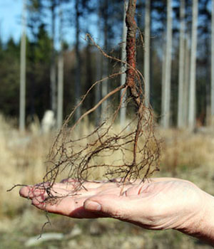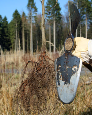 Nadelholz kommt häufig mit zum Teil sehr langen Fahnenwurzeln aus der Baumschule. Mit einem scharfen Beil können diese Wurzeln mit Bedacht abgeschnitten (nicht "abgequetscht") werden.