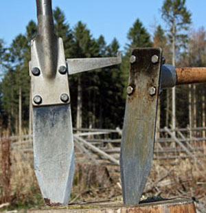 Abb. 3: Die Blätter der Pflanzwerkzeuge von Neheimer und Rhodener Verfahren sind ähnlich. Mit dem Pflanzspaten ist die Ausrichtung des Pflanzspaltes aber absolut senkrecht. Foto: J. Preller