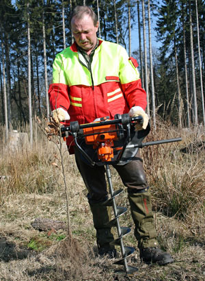 "Für den langfristigen Anwuchserfolg enorm wichtig ist das sorgfältige Verfüllen des Loches nach der Pflanzung", rät Martin Nolte. Es bestehe die Gefahr, dass nur der humusreiche Oberboden in das Loch gescharrt würde, weil sich der Mineralboden während des Bohrvorgangs zu weit verstreut habe. Die Leistung des für zwei Personen (Bohrer und Pflanzer) vorgesehenen Verfahrens liegt ebenfalls bei 60 bis 70 Pflanzen in der Stunde. Auf Flächen mit niedrigem Räumungsgrad kann der Einsatz von schiebbaren Bohrgeräten schwierig werden.