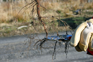 Abb. 6: Insbesondere beim Laubholz sollten zu lange Wurzeln mit einem scharfen Werkzeug abgeschnitten und nicht abgequetscht werden, sodass sie dann unverbogen und gerade im Pflanzloch stehen.