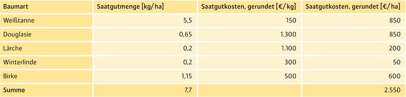 Um die Wahrscheinlichkeit für die Begründung von Mischbeständen unter einem entsprechenden Vorwaldschirm möglichst hoch zu halten, wurden für das Projekt vergleichsweise hohe Saatgutmengen angewendet. Die verwendeten Saatgutmengen sowie die Saatgutkosten sind in Abbildung 3 aufgeführt.